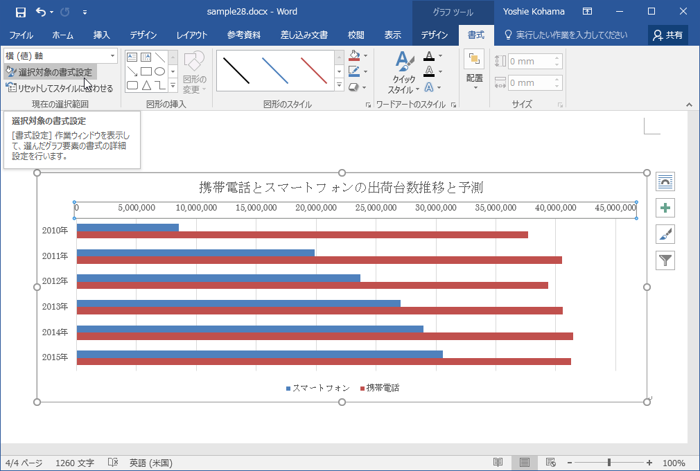 - グラフ内の値軸を選択して[グラフツール]の[書式]タブを開きます。
