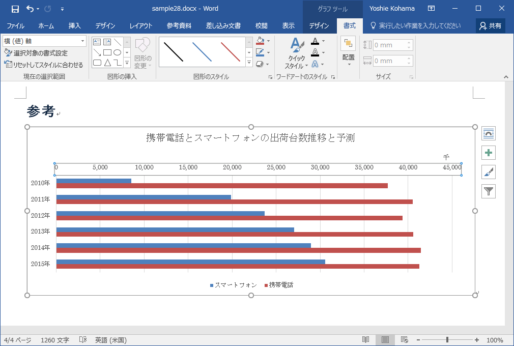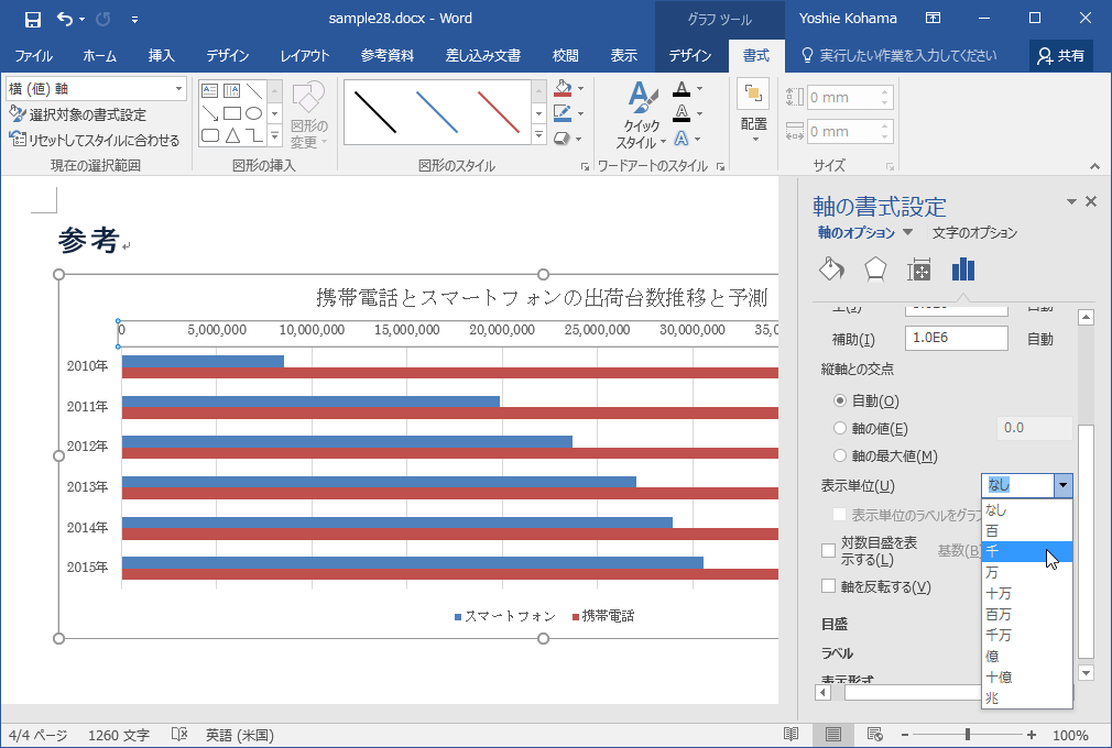Word 2016で千単位で値軸を表示するには、グラフ内の値軸を選択して[グラフツール]の[書式]タブを開き、[選択対象の書式設定]をクリックして[軸の書式設定]ウィンドウを開き、表示単位を千単位にします。