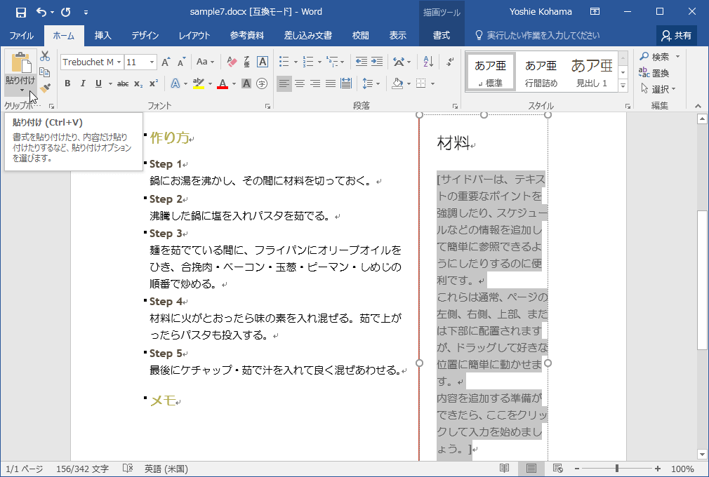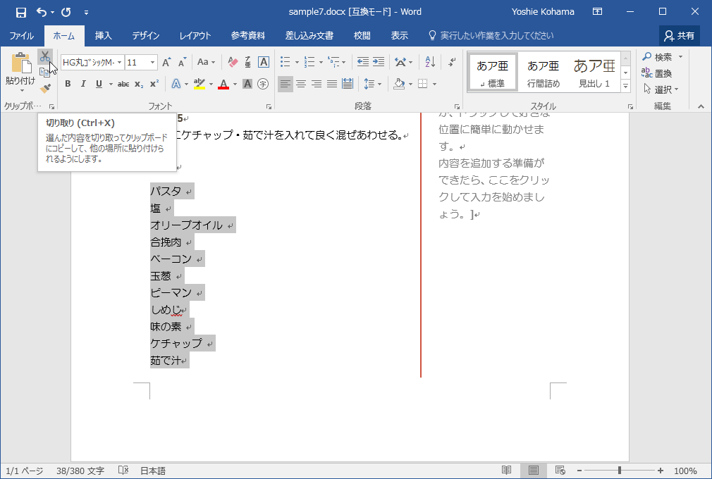- 既存の文書内の「パスタ」から「茹で汁」までを範囲選択して、[クリップボード]グループの[切り取り]をクリック、もしくはショートカットキーCtrl+Vキーを押します。
