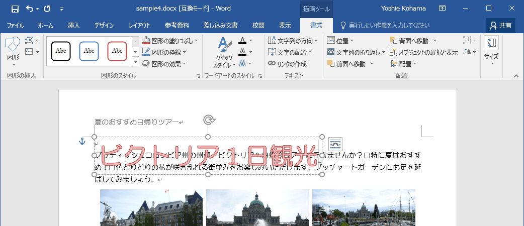 - [ここに文字を入力]と表示され、選択された状態となるので、このまま文字を入力します。ここでは「ビクトリア1日観光」と入力します。