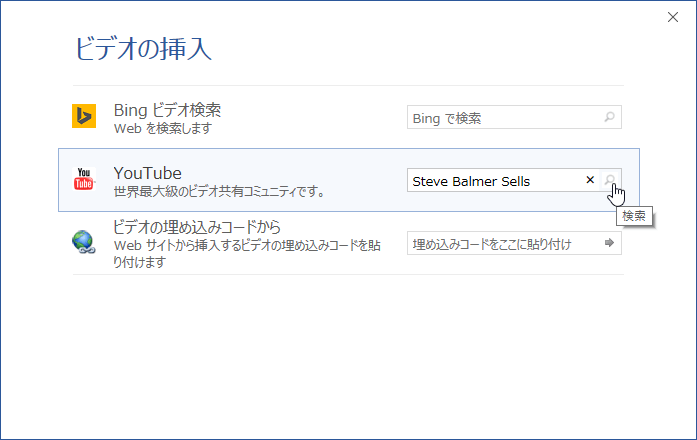 - [ビデオの挿入]ダイアログ内のYouTubeの検索ボックスにキーワードを入力して[検索]をクリックします。