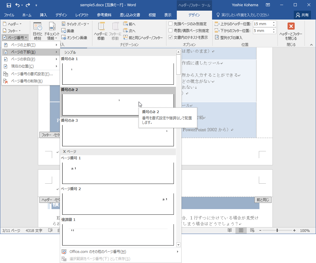 - [ヘッターとフッター]グループの[ページ番号]ボタンをクリックし、サブメニューから挿入位置と配置を指定してページ番号を挿入します。