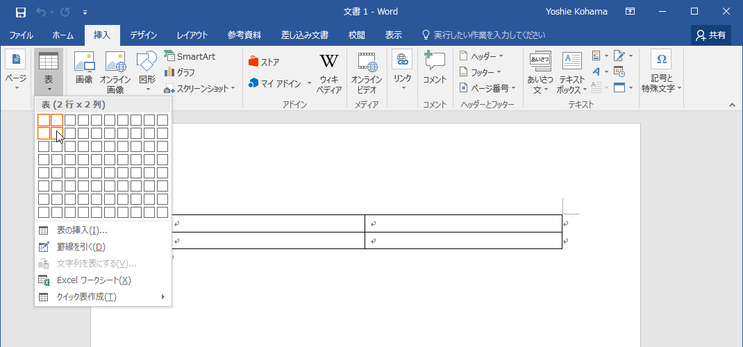 2 x 2 の表が挿入された - 1列目には、対象とする文書に含まれている語句を正確に入力(大文字、小文字、全角、半角が区別される)して、[Tab]キーを押します。確実に索引登録されるためには、対象となるファイルを開き、その語句を1列目に貼り付けるとよいでしょう。