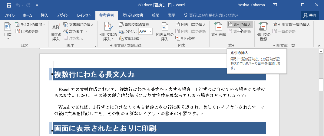 - [参考資料]タブを開き、[索引]グループの[索引の挿入]をクリックします。