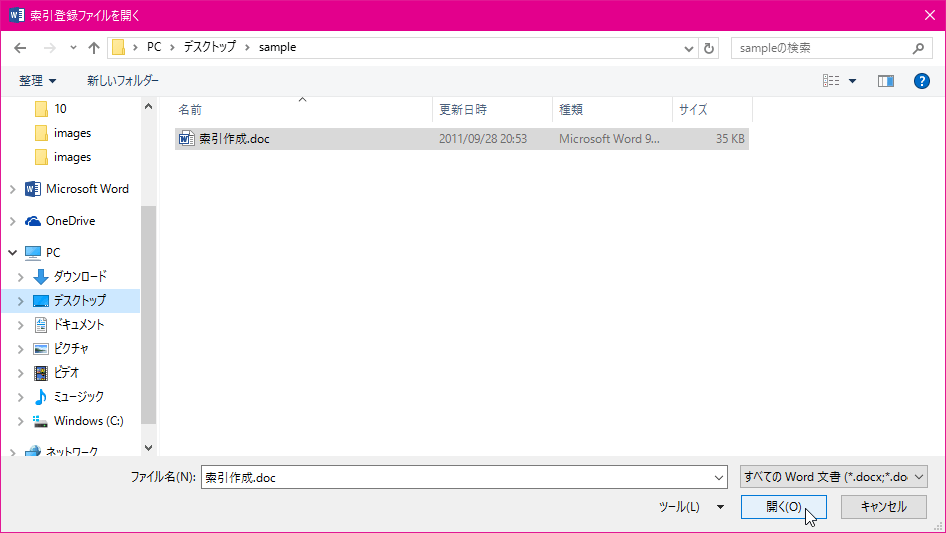 - [索引登録ファイルを開く]ダイアログボックスで、そのファイルを選択して[開く]ボタンをクリックします。