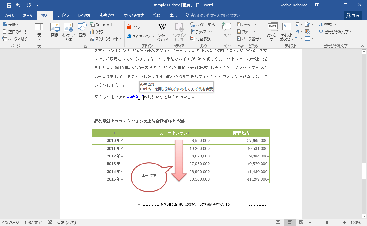 - ジャンプ先の先頭にカーソルを移動します。ここでは、最終ページの「参考資料」の先頭にカーソルを移動します。