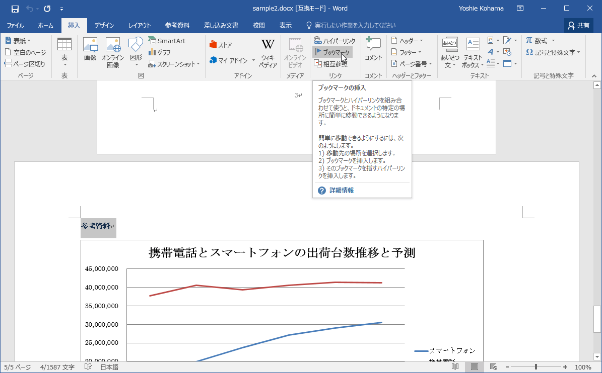 - [ブックマーク名]ボックスにブックマーク名を入力します。ここでは「参考資料」と入力します。