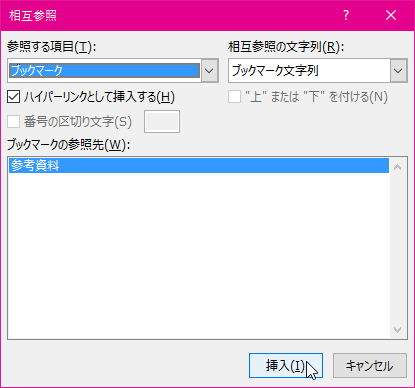 - [相互参照]ダイアログボックスの[参照する項目]ボックスから[ブックマーク]を選択します。