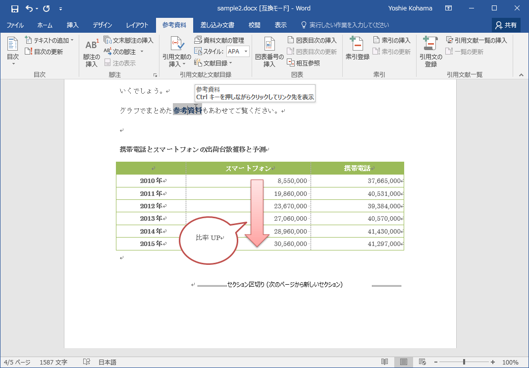 - 相互参照を挿入したい場所を選択します。ここでは、4ページ目の「参考資料」を選択します。