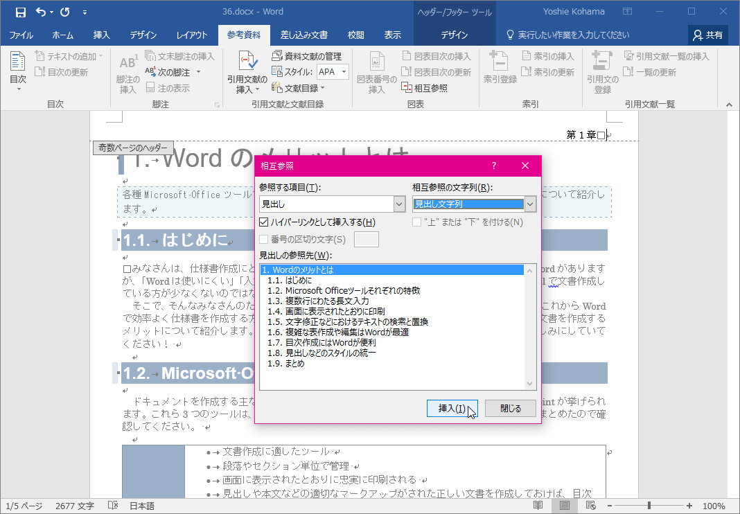 - 見出し番号を入れるには、[相互参照]ダイアログボックスの[参照する項目]を「見出し」に設定し、[相互参照の文字列]を「見出し番号」に設定して、見出しの参照先を選択し、[挿入]ボタンをクリックします。