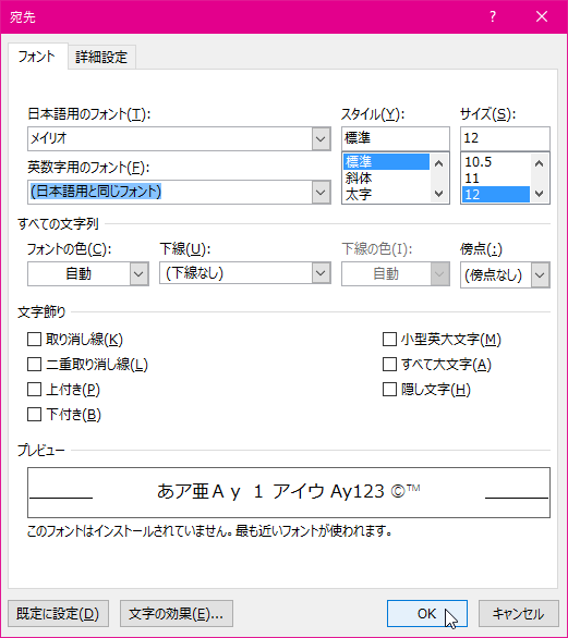 - [フォント]ダイアログボックスが表示されるので、そこでフォントやフォントサイズなどを指定できます。