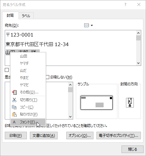 - 宛名入力ボックスのフォントを変更したい文字を選択して右クリックしてショートカットメニューより[フォント]を選択します。
