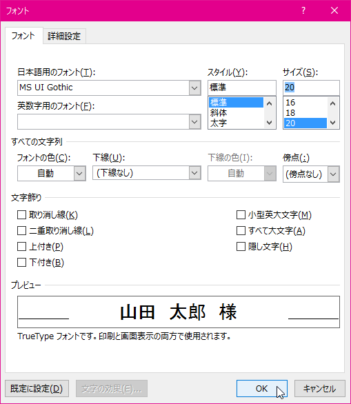 - フォントサイズなどを指定して[OK]ボタンをクリックします。