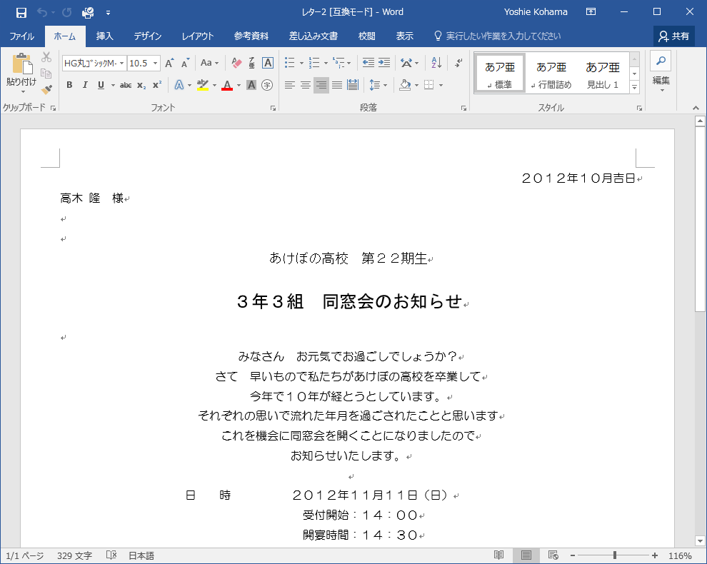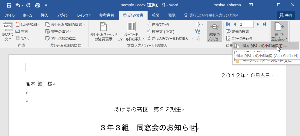 差し込み印刷には、アドレス帳のリストファイルとセットになっています。他の人に配布する場合、Word 2016で差し込み結果から新規文書に作成するとよいでしょう。[差し込み文書]タブの[完了と差し込み]オプションから[個々のドキュメントの編集]を選択して、[新規文書への差し込み]ボックスにて対象となるレコードを指定します。