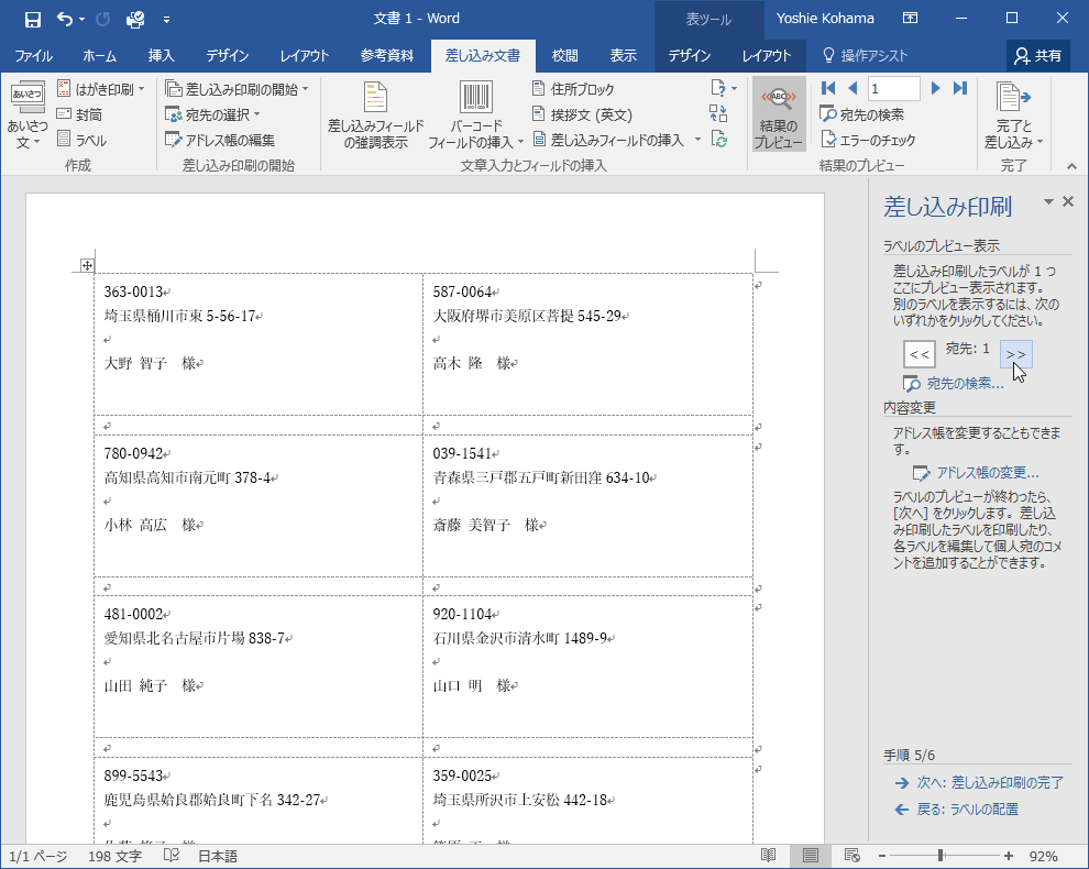 Word 2016でのラベルのプレビュー表示では、差し込み印刷されたラベルが1枚のシートにプレビューされます。続きのラベルを表示するには、[差し込み印刷]作業ウィンドウの[>>]ボタンをクリックしていくとOKです。また、ここでアドレス帳を変更することも可能です。
