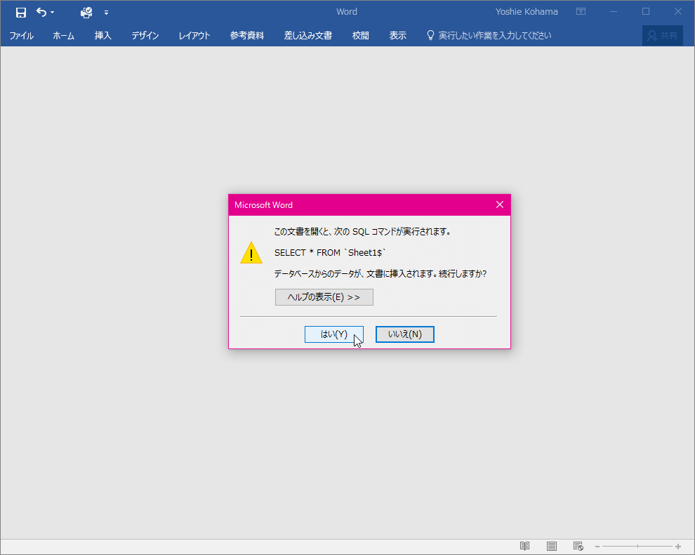 - Word起動時に「この文書を開くと、次のSQLコマンドが実行されます…」というメッセージが表示されるので、[はい]ボタンをクリックします。