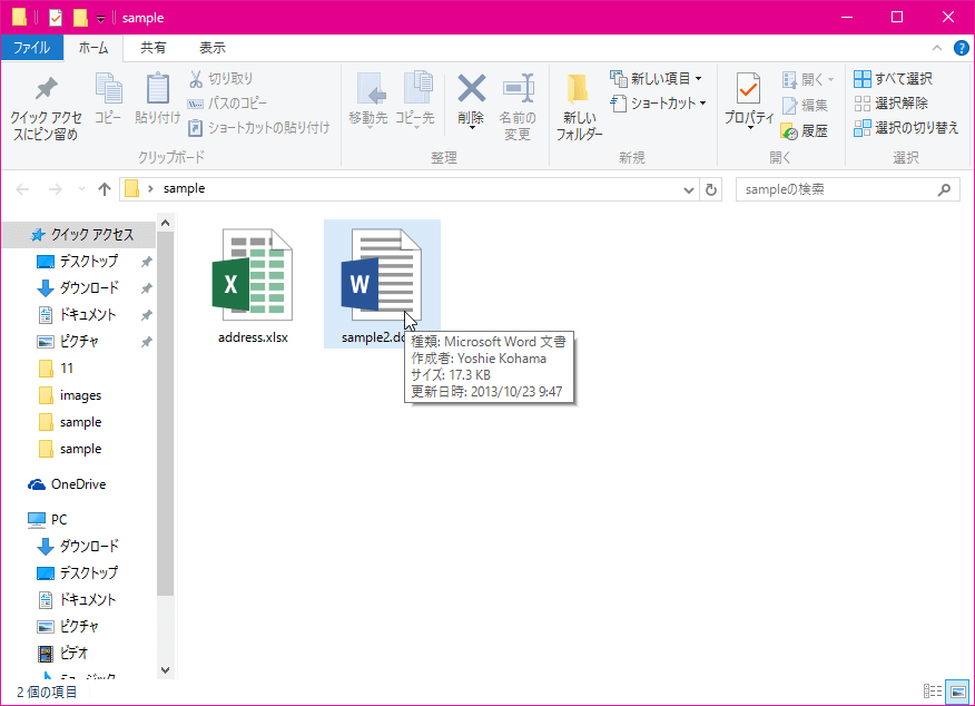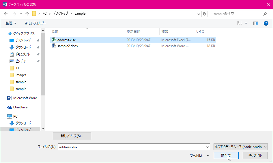 - [データファイルの選択]ダイアログボックスで、「address.xlsx」を指定して[開く]ボタンをクリックします。