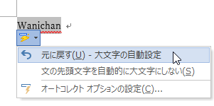 既定では[オートコレクトオプション]ボタンが表示されるようになっています。もし、先頭文字を小文字にしたい場合は、下の図のように[元に戻す - 大文字の自動設定]をクリックします。ここで[文の先頭文字を自動的に大文字にしない]を選択すると、[オートコレクト]の設定で[文の先頭文字を大文字にする]のチェックが外れます。
