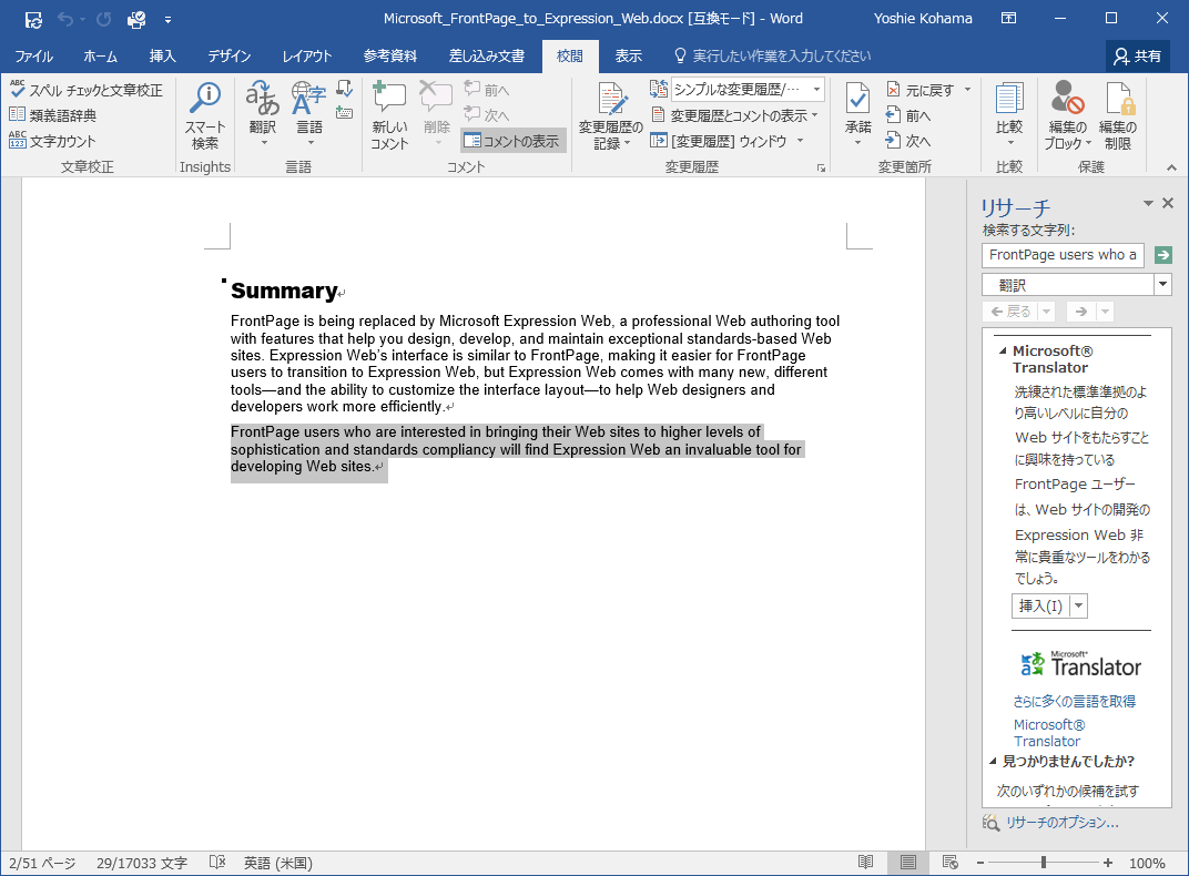 [リサーチ]作業ウィンドウのMicrosoft Translatorによる翻訳結果を挿入するには、[挿入]ボタンを使って挿入またはコピーが行えます。[挿入]をクリックすると、選択した文字列が翻訳結果に置き換えられます。