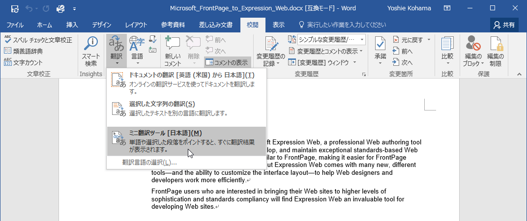 [ミニ翻訳ツール]を有効にするには
