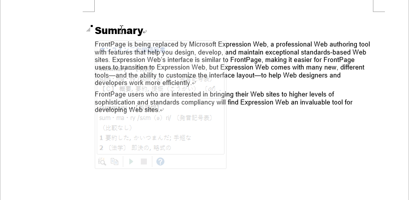- 調べたい単語にポイントすると、その意味がツールチップとしてうすく表示されます。