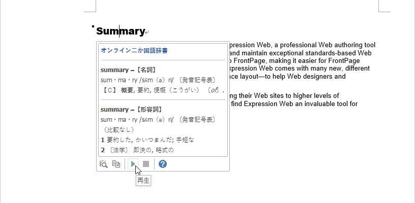 - 英語の場合は、再生ボタンをクリックすることでその単語が音声として確認できます。