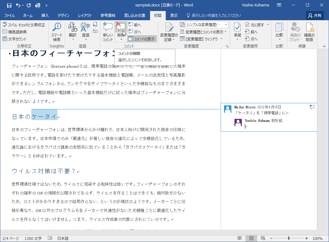 返信コメントを削除するには、その返信コメントを選択して、[コメントの削除]をクリックするとOKです。