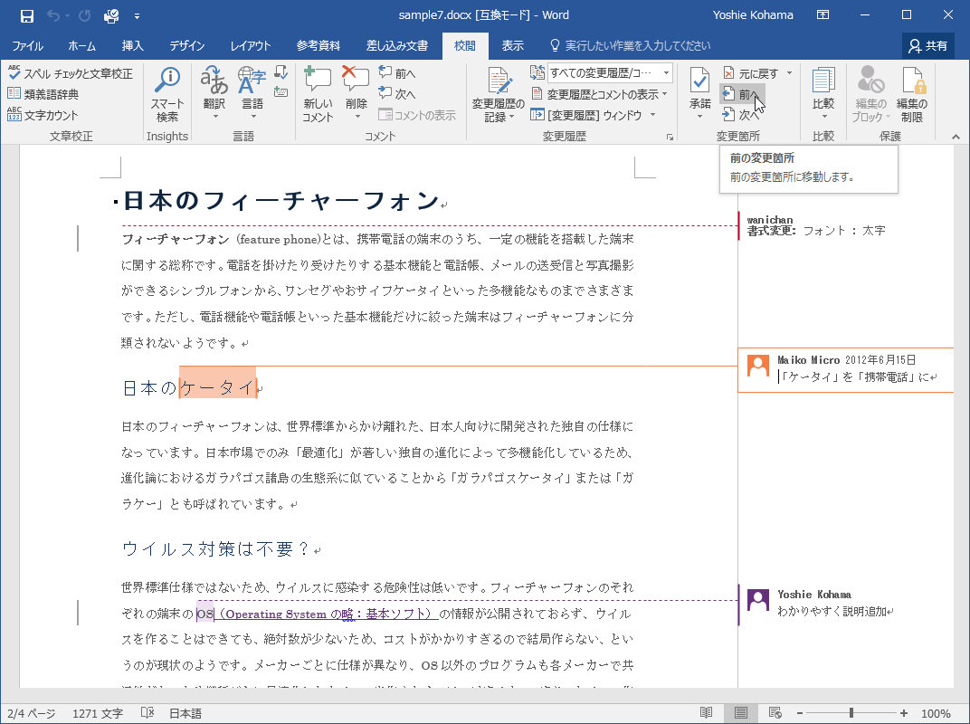 - [変更箇所]グループの[前へ]をクリックすると、前の変更箇所にジャンプします。