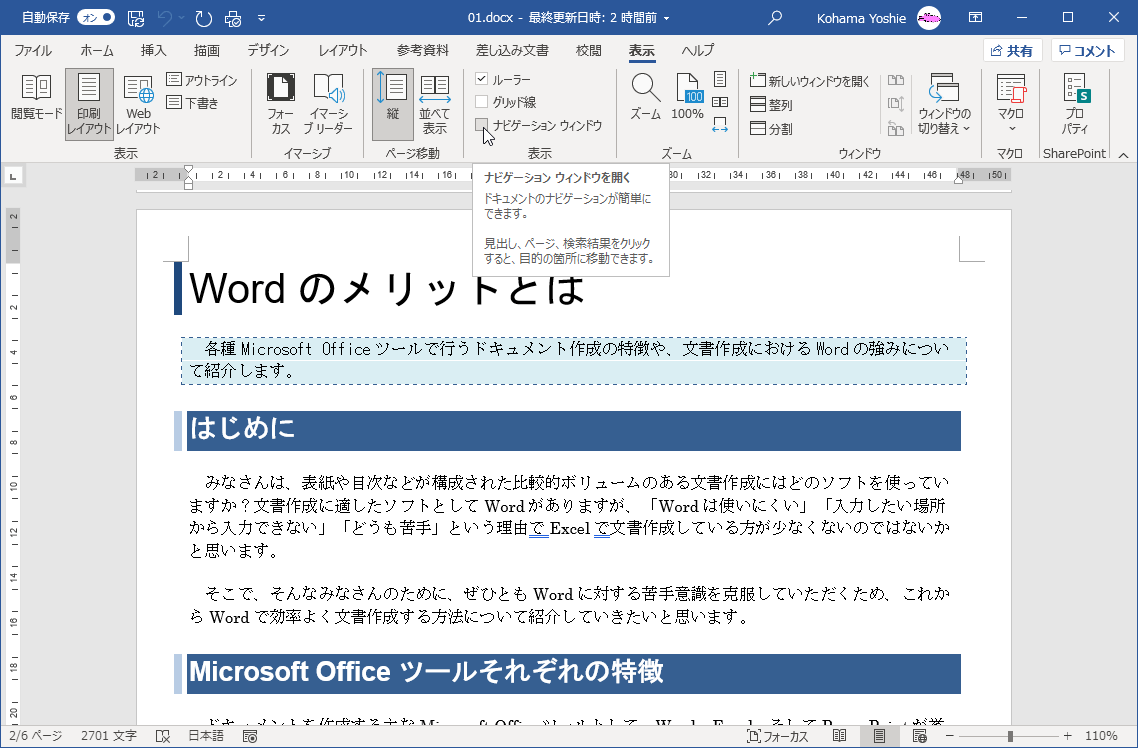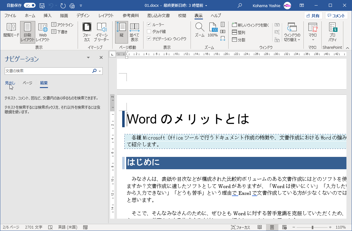 ナビゲーションウィンドウを使用すると、文書内のその見出しにすばやくジャンプできます。ここでは、ナビゲーションウィンドウを表示する方法、および、見出しの場所にすばやく移動する方法について説明します。