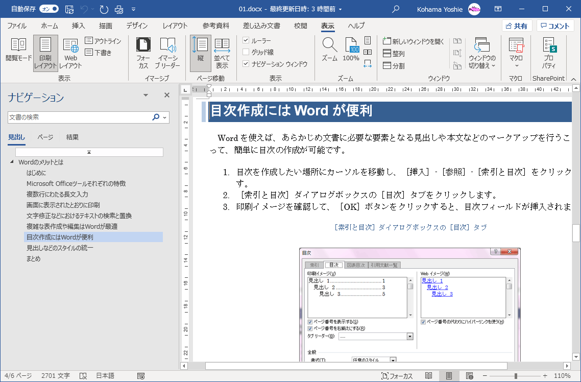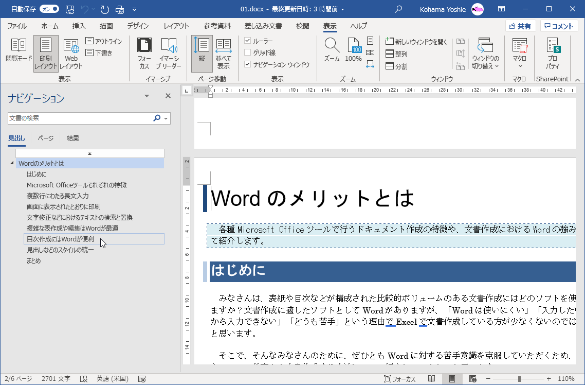 - ナビゲーションウィンドウの見出し一覧から「目次作成にはWordが便利」を選択します。