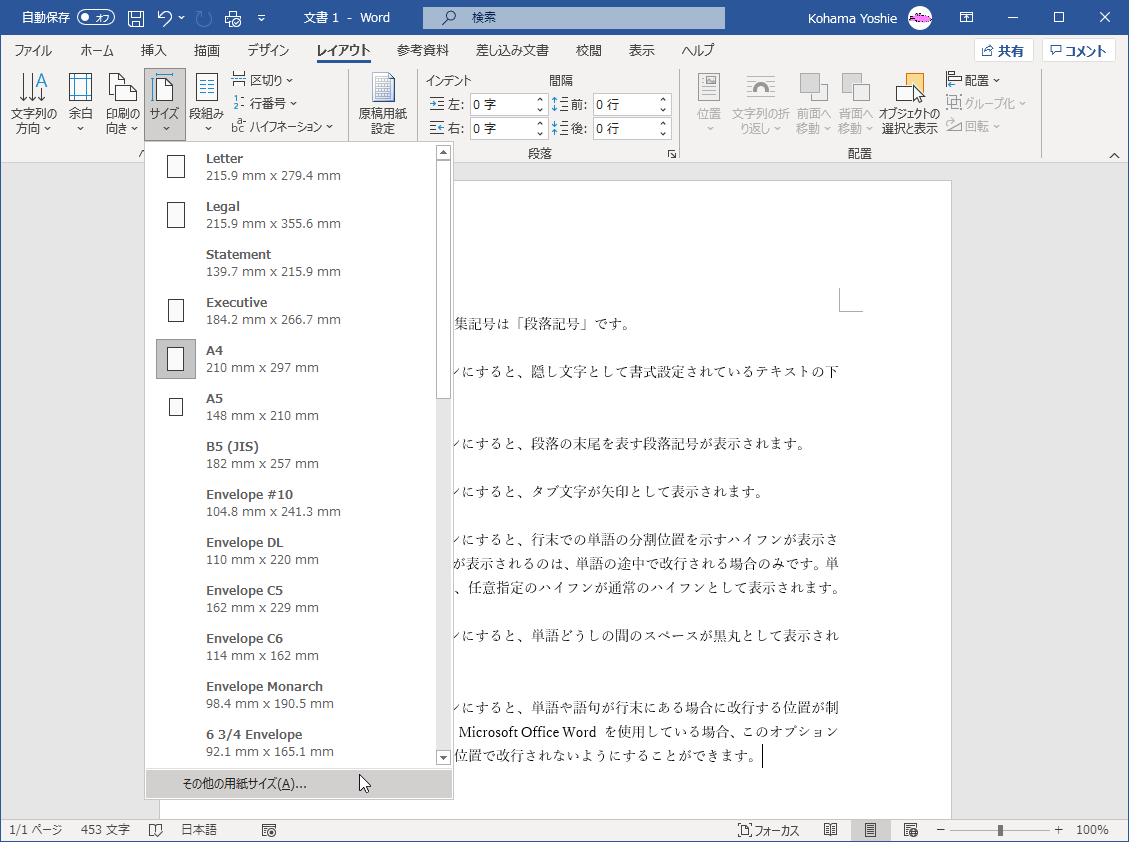 ドキュメントの用紙サイズを選択するには、[レイアウト]タブを開き[ページ設定]グループの[用紙サイズ]をクリックして、一覧から変更したい用紙サイズを選択するとスムーズです。その他の用紙サイズを選択するには、[その他の用紙サイズ]を選択し、[ページ設定]ダイアログボックスの[用紙]タブの[用紙サイズ]オプションより選択または設定します。