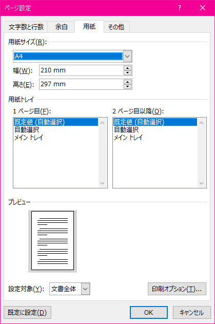 - [レイアウト]タブを開き、[ページ設定]グループにある[サイズ]をクリックし、一覧から[その他の用紙サイズ]を選択します。