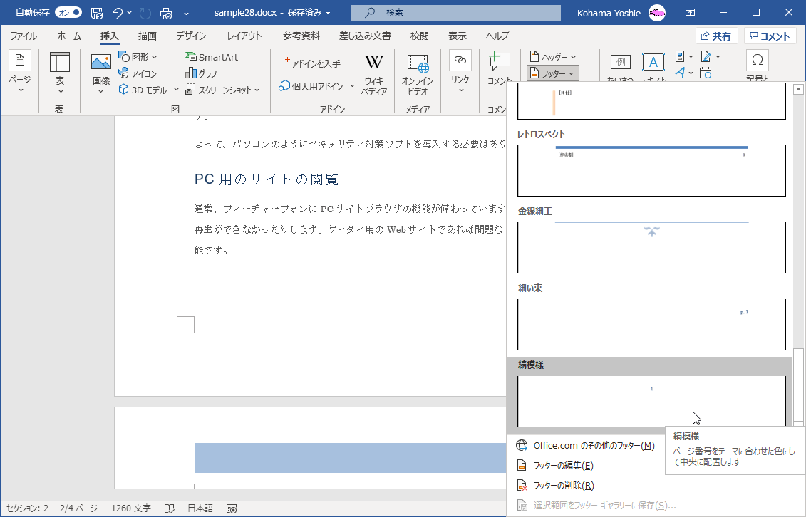 各ページの下部に同じ内容を表示するには、[挿入]タブを開き、[ヘッダーとフッター]グループの[フッター]をクリックして、目的の組み込みフッターまたはコマンドを選択します。