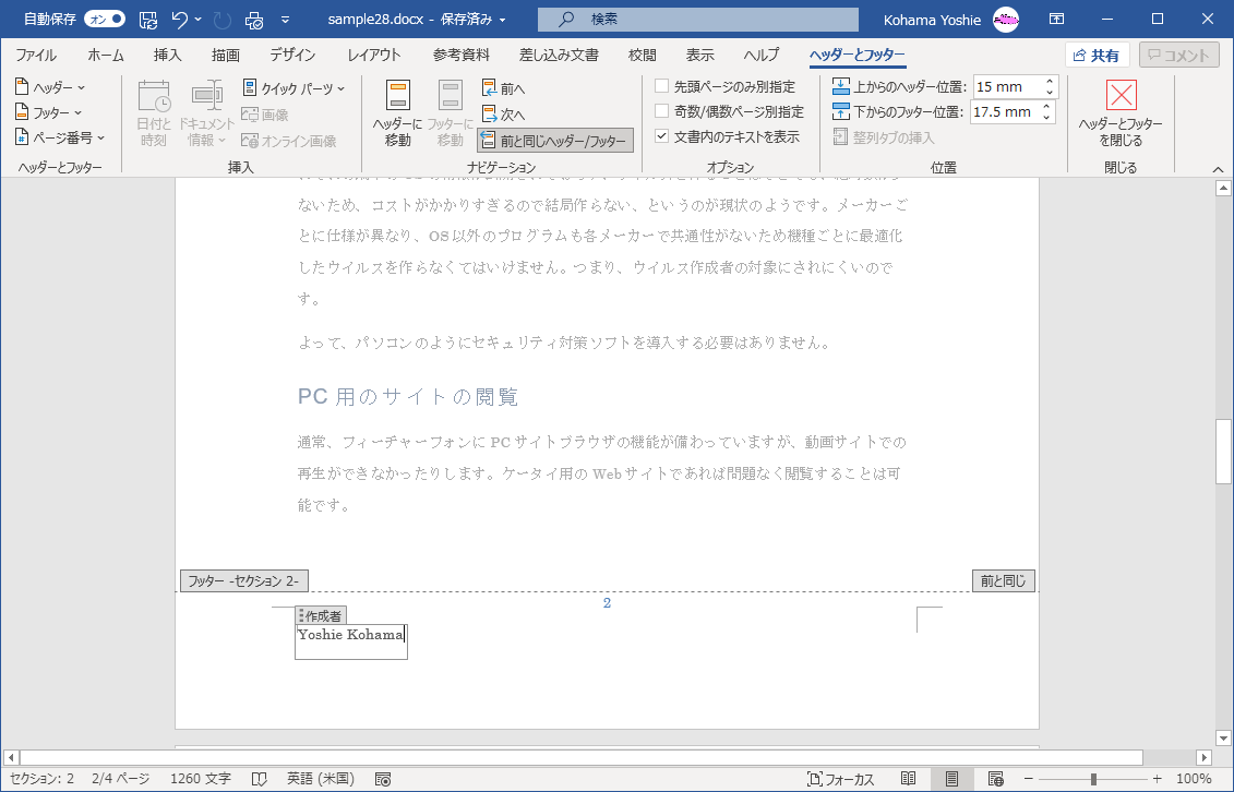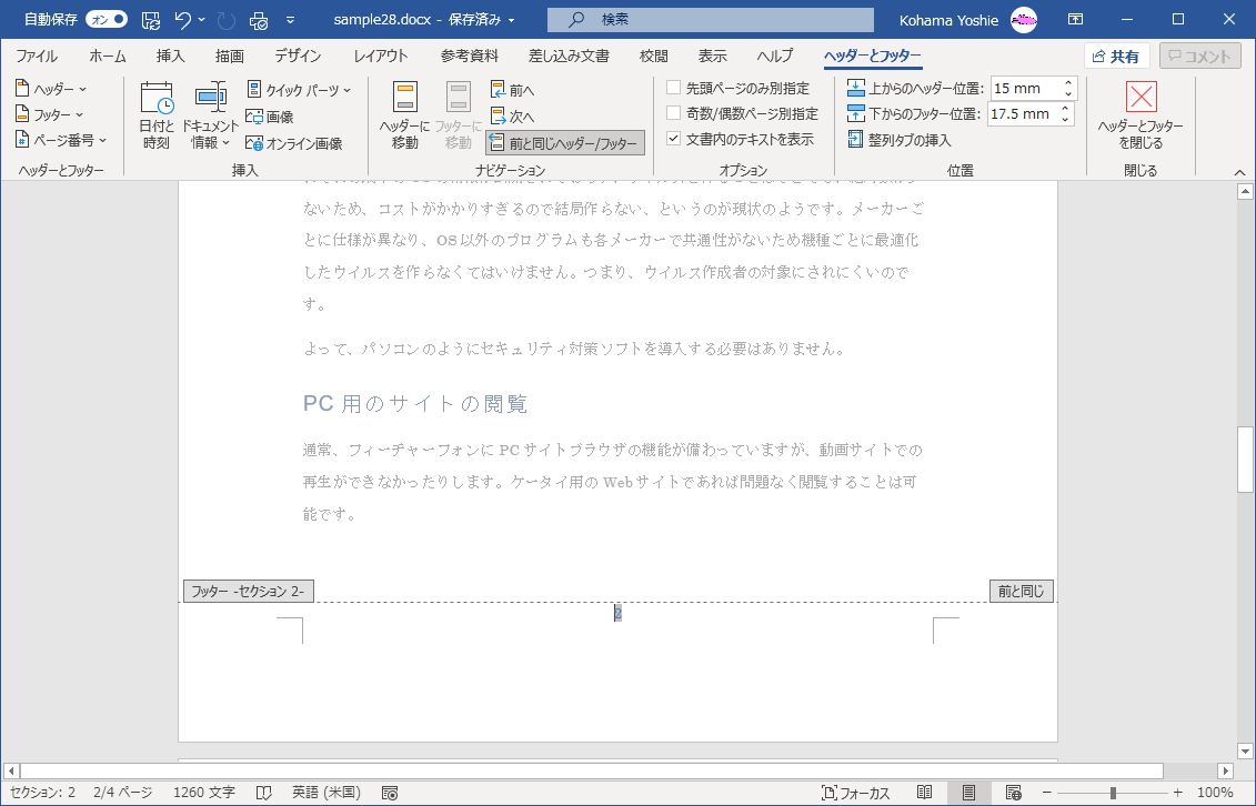 - [挿入]タブを開き、[ヘッダーとフッター]グループの[フッター]をクリックします。