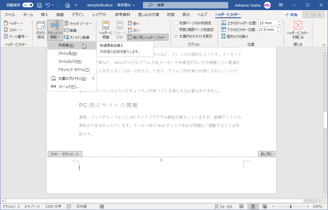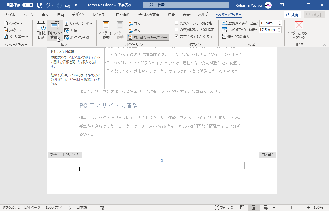 - [挿入]グループの[ドキュメント情報]をクリックします。