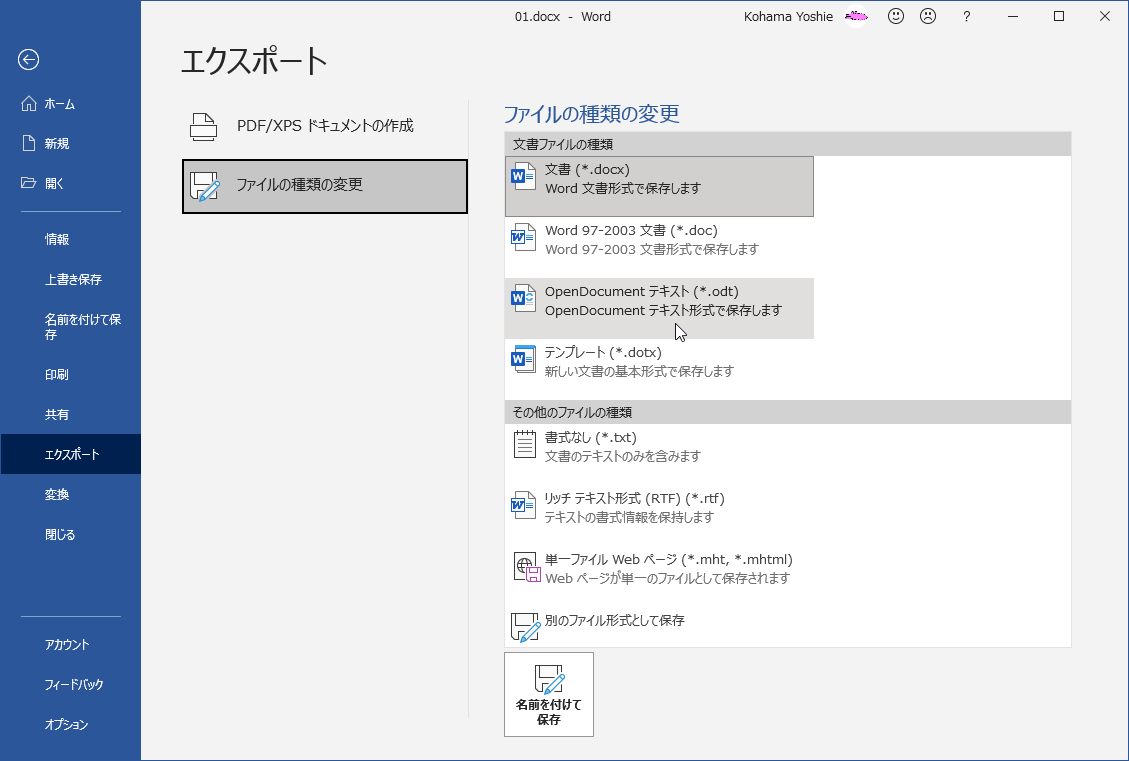 OpenOfficeドキュメント、テキスト形式、単一ファイルWebページ等の別のファイル形式で文書を保存するには、[ファイル]タブをクリックし、[エクスポート]をクリックして、[ファイルの種類と変更]を選択し、ファイルの種類を選択します。