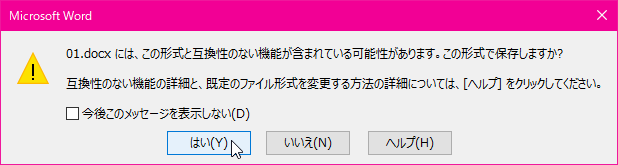 ![Microsoft Word 01.docx には、この形式と互換性のない機能が含まれている可能性があります。この形式で保存しますか? 互換性のない機能の詳細と、既定のファイル形式を変更する方法の詳細については、[ヘルプ]をクリックしてください。](images/34-6.png)