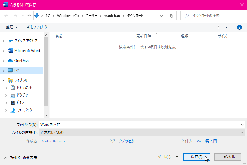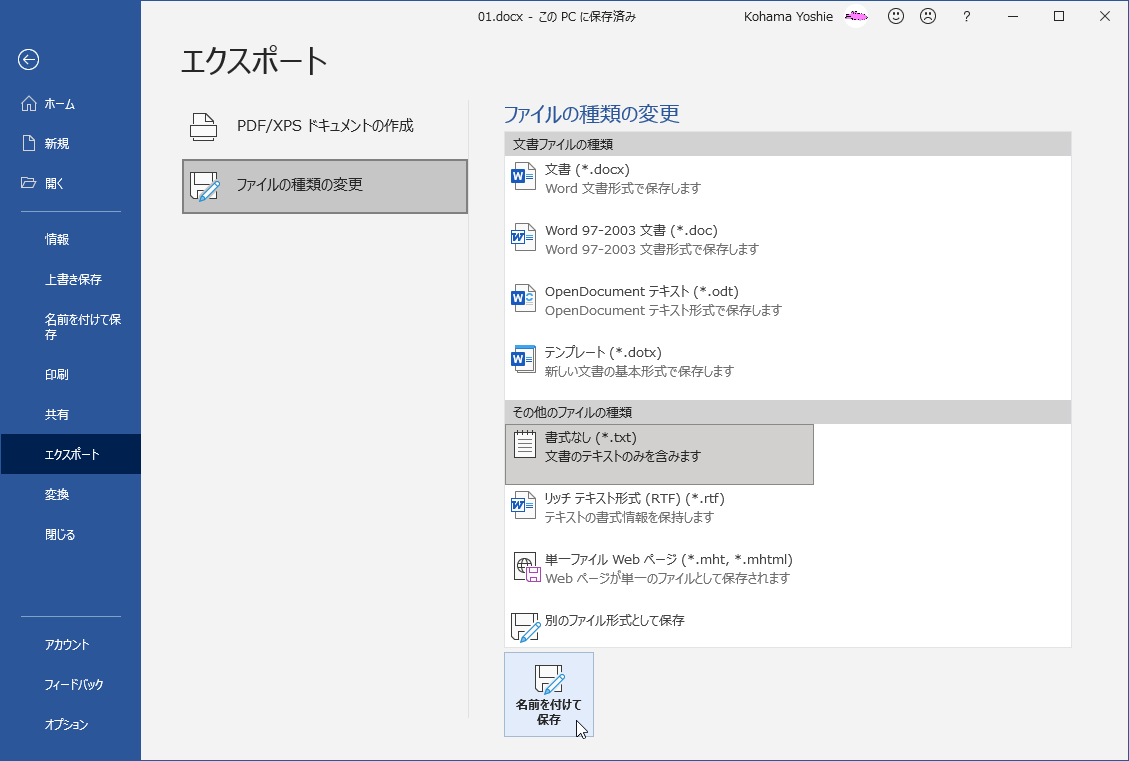 - [その他のファイルの種類]一覧から[書式なし]を選択して、[名前を付けて保存]ボタンをクリックします。