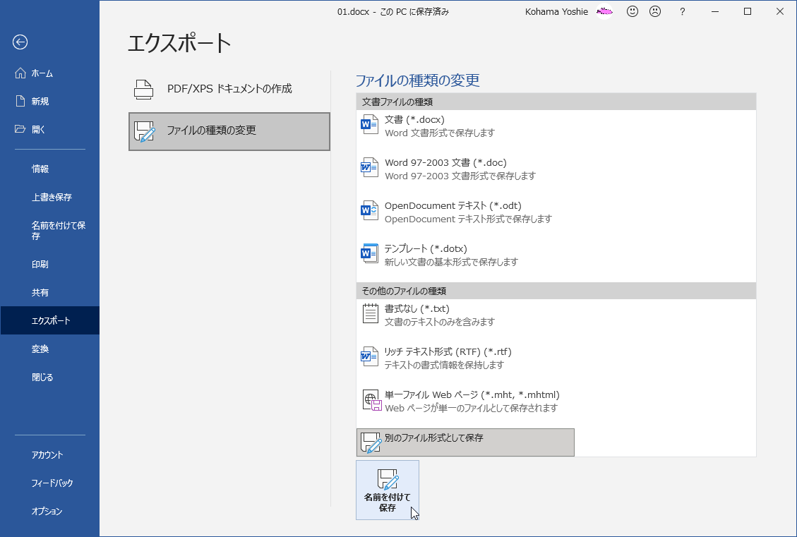 [エクスポート]の[ファイルの種類の変更]一覧にない場合は、[その他のファイルの種類]一覧から[別のファイル形式として保存]を選択し、[名前を付けて保存]ダイアログボックスで、ファイル形式と名前などを指定します。