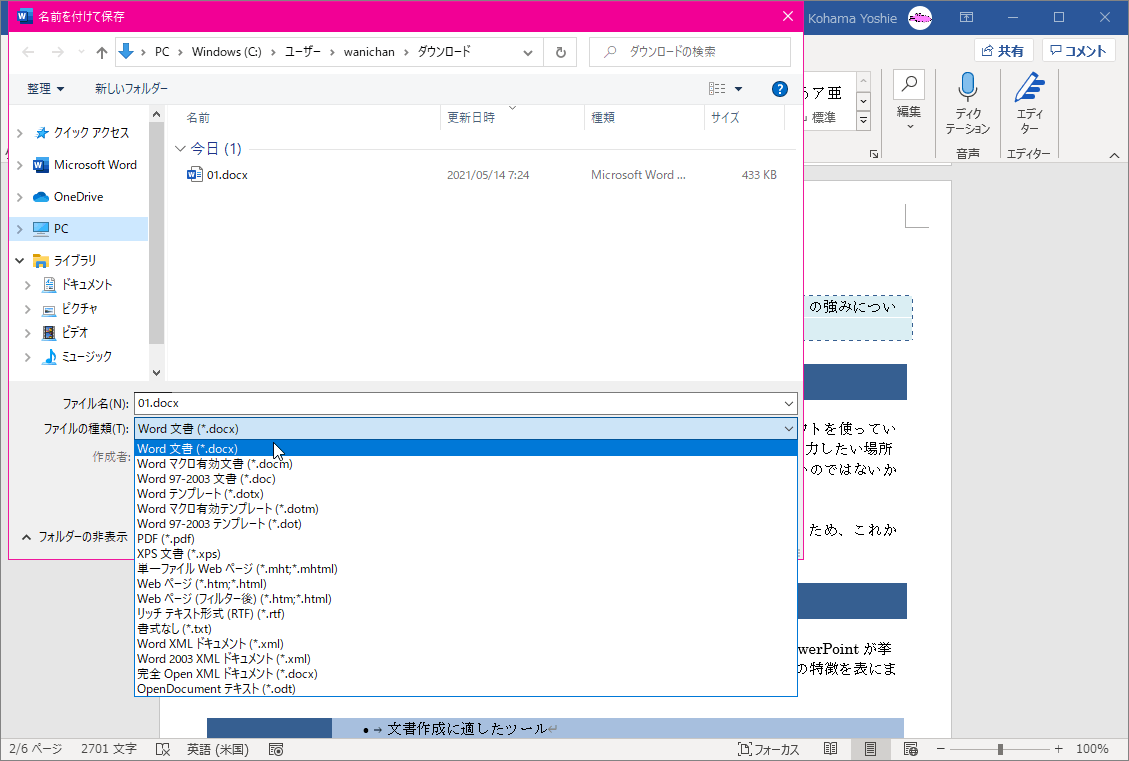 Word文書形式(.docx)に限らず、テキスト形式、単一ファイルWebページ、OpenOfficeドキュメント等の別のファイル形式で文書を保存することができます。また、旧形式のWord文書形式で保存することも可能です。