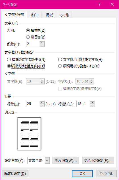 [ページ設定]ダイアログボックスの[文字列と行数]タブでも段数の指定は可能ですが、段幅は均等となります。