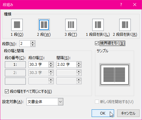 - [段の幅と間隔]オプションで、それぞれ指定して[OK]ボタンをクリックします。