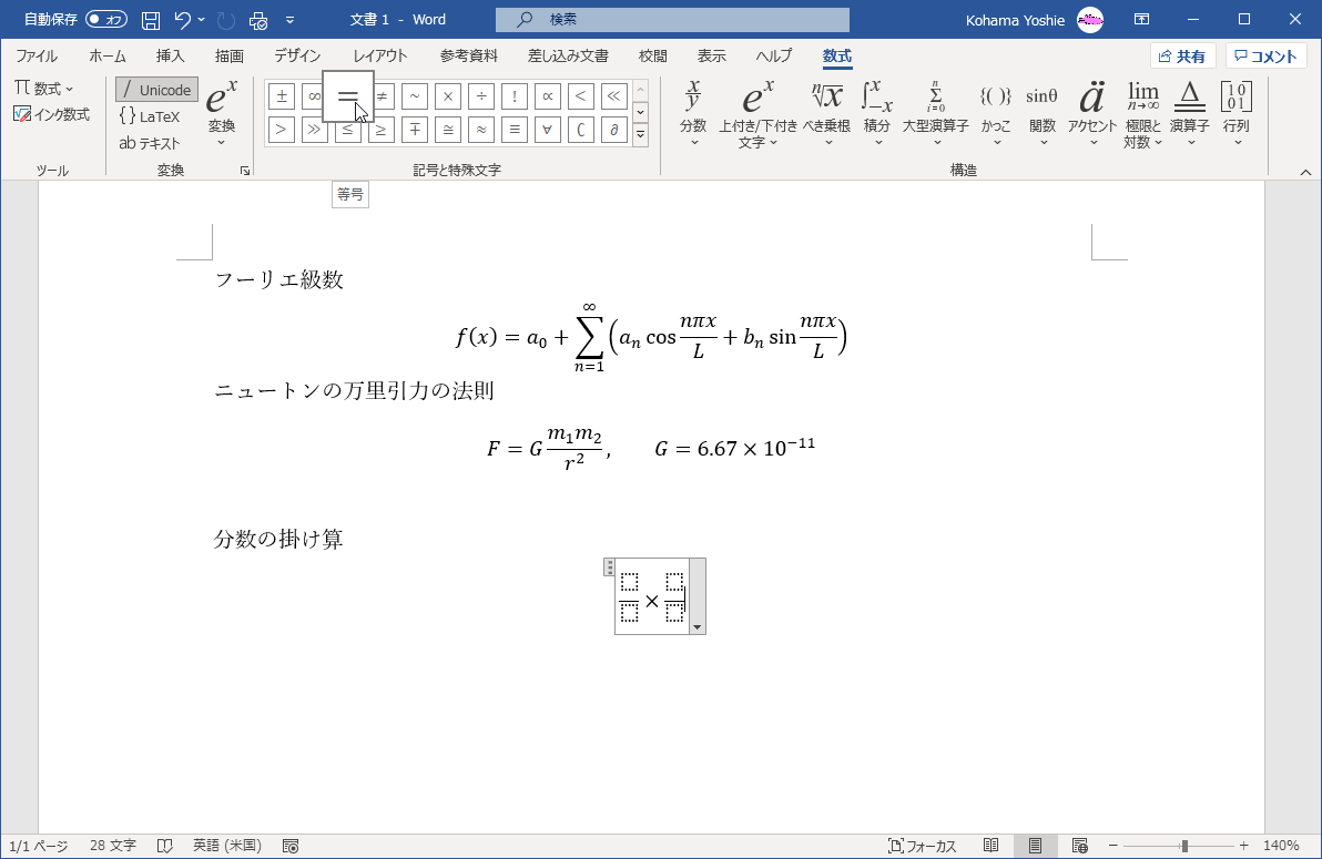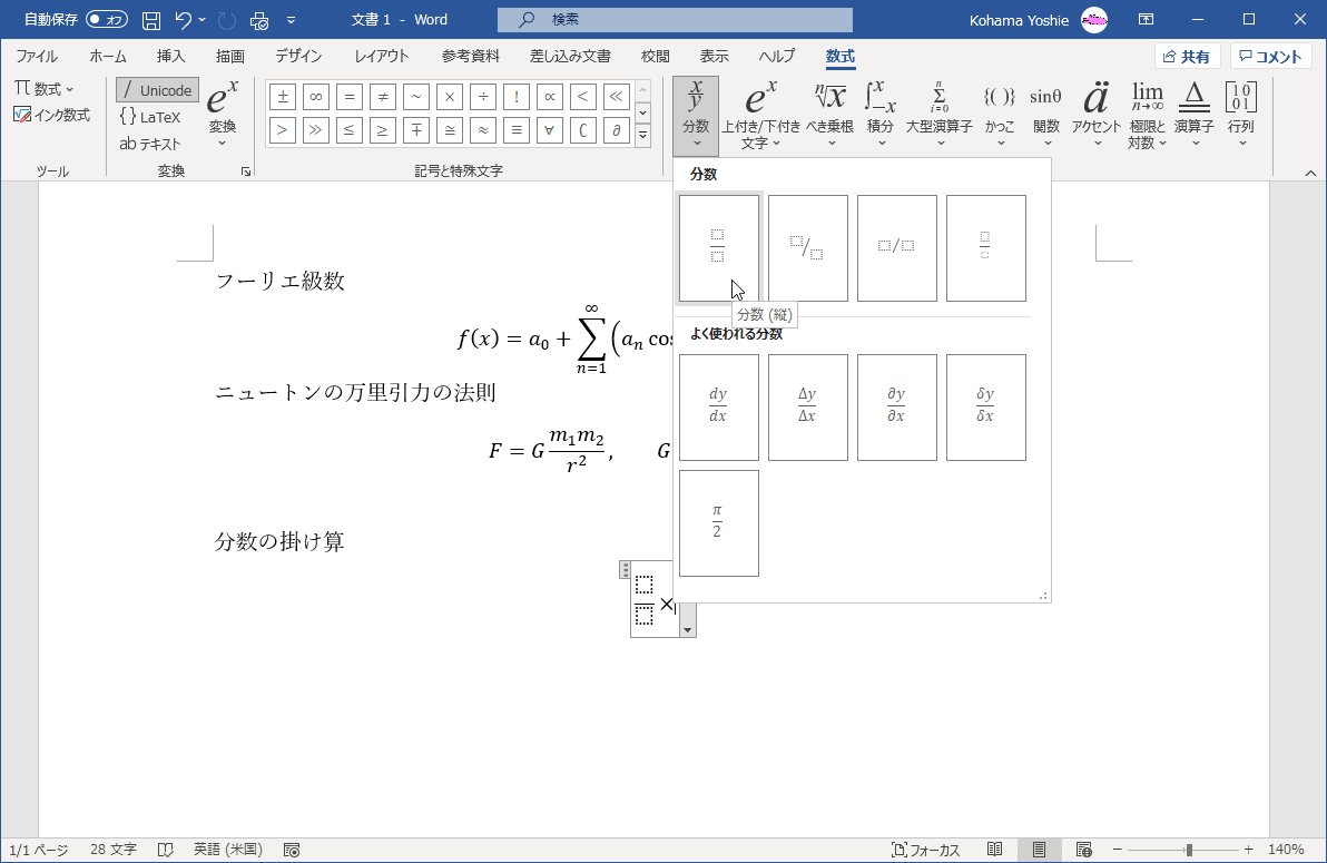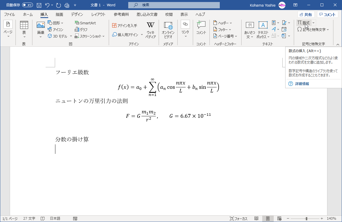 分数やルートなどの数式を挿入するには、[挿入]タブを開き、[数式]をクリックします。[数式]タブが表示され、数式を挿入するための様々な分数、べき乗、大型演算子を選択し、数字などを入力していきます。ショートカットキーはAlt+=です。