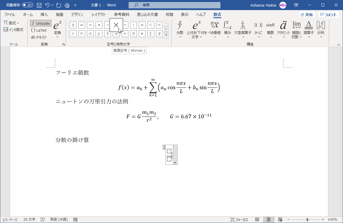 - [挿入]タブを選択し、[記号と特殊文字]グループの[数式]をクリックします。