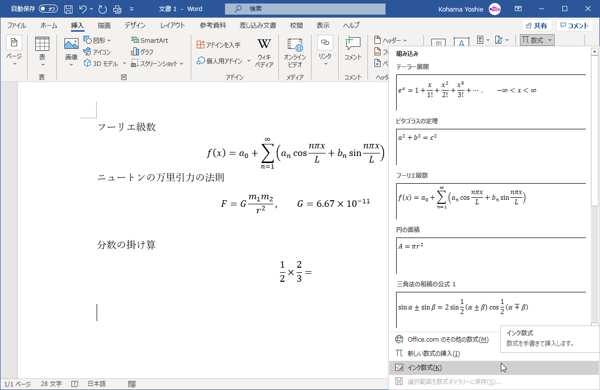 インク数式を挿入するには