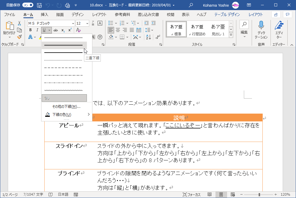 選択した文字への下線スタイルの適用に線の種類を選択するには