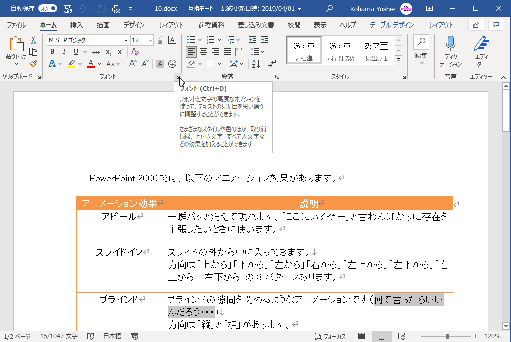 太くしたり斜体文字などの文字修飾するには、[ホーム]タブの[フォント]グループにある[太字(Ctrl+B)]、[斜体(Ctrl+I)]や[下線(Ctrl+U)]等のボタンをクリックします。ショートカットキーを利用するとスムーズです。二重取り消し線は[フォント]ダイアログボックスで行えます。