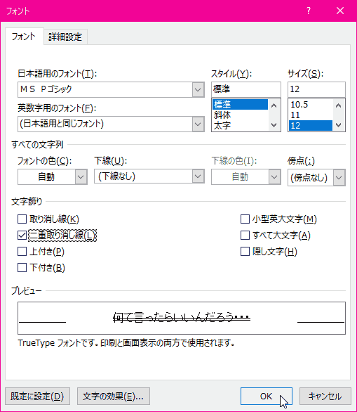 - [フォント]ダイアログボックスの[二重取り消し線]にチェックを入れて[OK]ボタンをクリックします。
