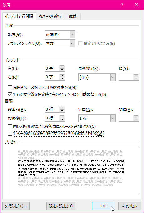1ページの行数を指定時に文字を行グリッド線に合わせない