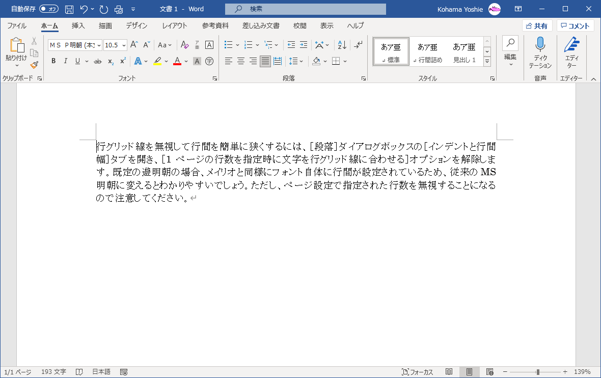 既定の遊明朝の場合、メイリオと同様にフォント自体に行間が設定されているため、従来のMS明朝に変えるとわかりやすいでしょう。ただし、ページ設定で指定された行数を無視することになるので注意してください。